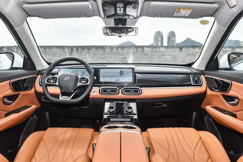 内饰呈T字形布局,采用黑色和橙色皮质包装,中控台、车门内饰板、前排扶手箱等处均有体现。台面使用钢琴烤漆材质饰以镀铬条纹,视觉效果精致。配备悬浮式双联屏,由12.3英寸全液晶仪表盘和12.3英寸中控屏组成,设计更贴近驾驶员,便于操作。前排岛台设有物理旋钮和触控式面板,并提供50瓦无线充电面板,方便手机充电。还提供OTA升级、连续语音识别、L2级辅助驾驶等功能。