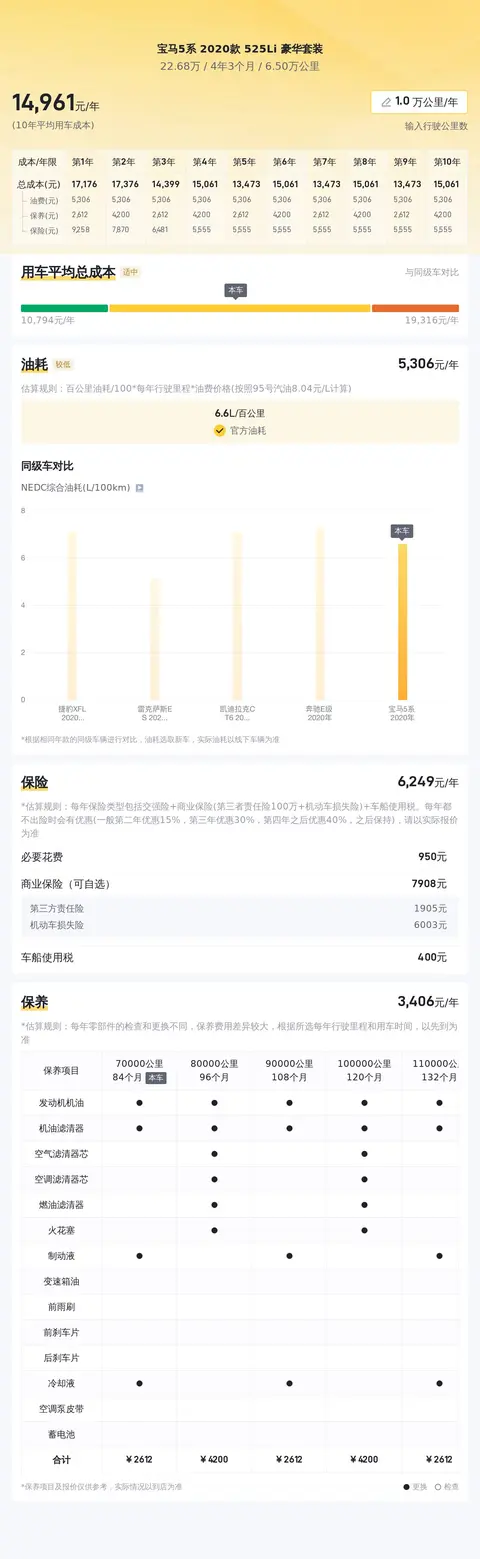 据估算,同级车的最低用车成本是6506元/年,最高是18790元/年,宝马5系 2020款 525Li 豪华套装是14744元/年,用车成本不算低。