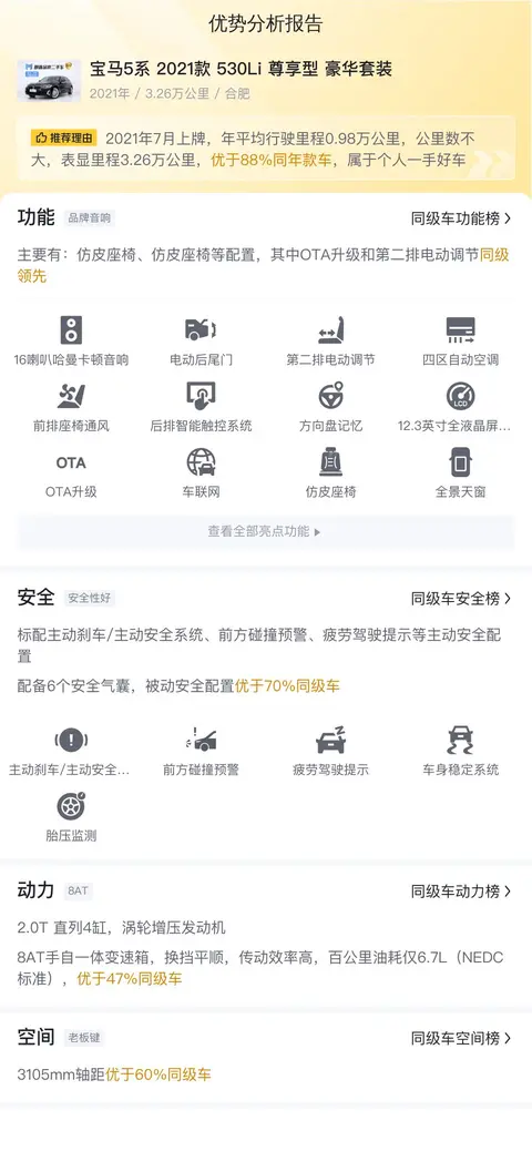 综上所述的新车含税价、用车成本、市场行情、优势分析、同款比价等数据仅供参考。在配置部分,因为二手车非标品,车辆可能会存在配置改装的情况,具体车况信息需要线下结合车辆实际情况进行综合参考。