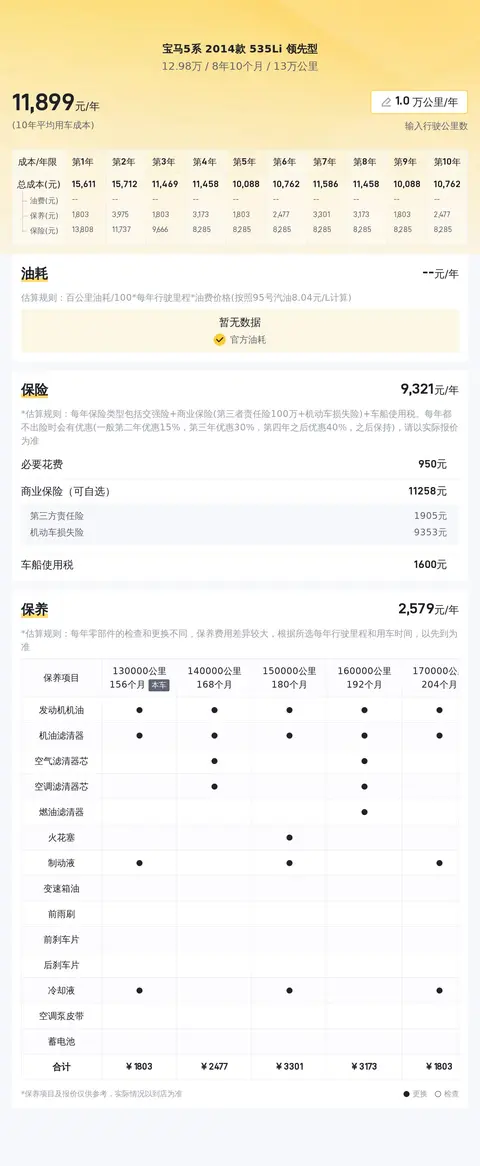根据估算,这辆 2014 款宝马 535Li 领先型的年度用车成本大约为 21,787 元左右。其中包括油费约 13,680 元、保险费用约 6,609 元及保养成本约为 498 元。这些数字基于平均油耗、保险行业标准费率以及合理的保养频率进行估算。