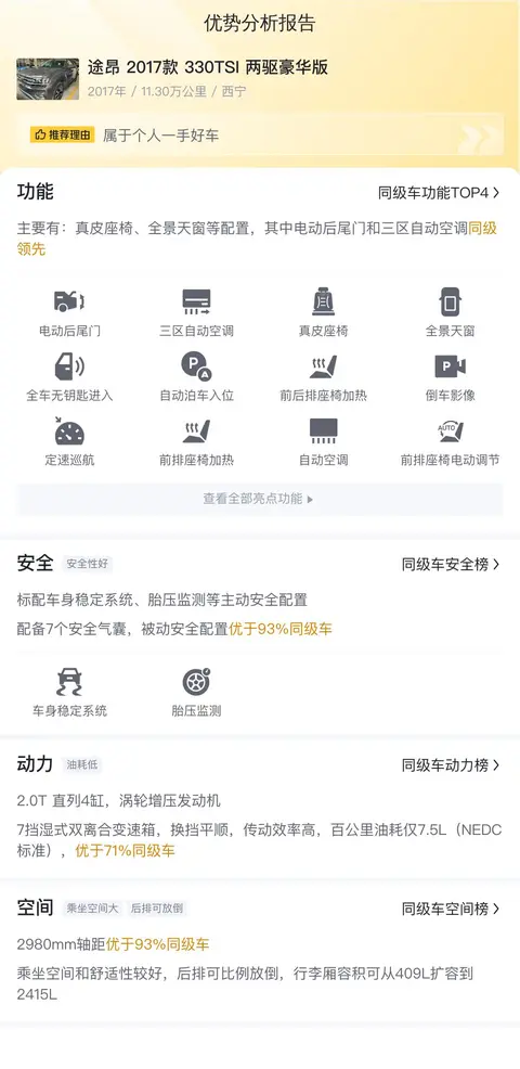 综上所述的新车含税价、用车成本、市场行情、优势分析、同款比价等数据仅供参考。在配置部分,因为二手车非标品,车辆可能会存在配置改装的情况,具体车况信息需要线下结合车辆实际情况进行综合参考。
