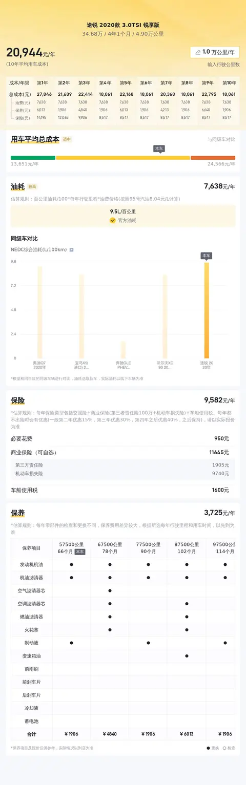 这台二手车的10年平均用车成本约为21285元/年,当然,具体还得看各位车主的具体使用情况哈!