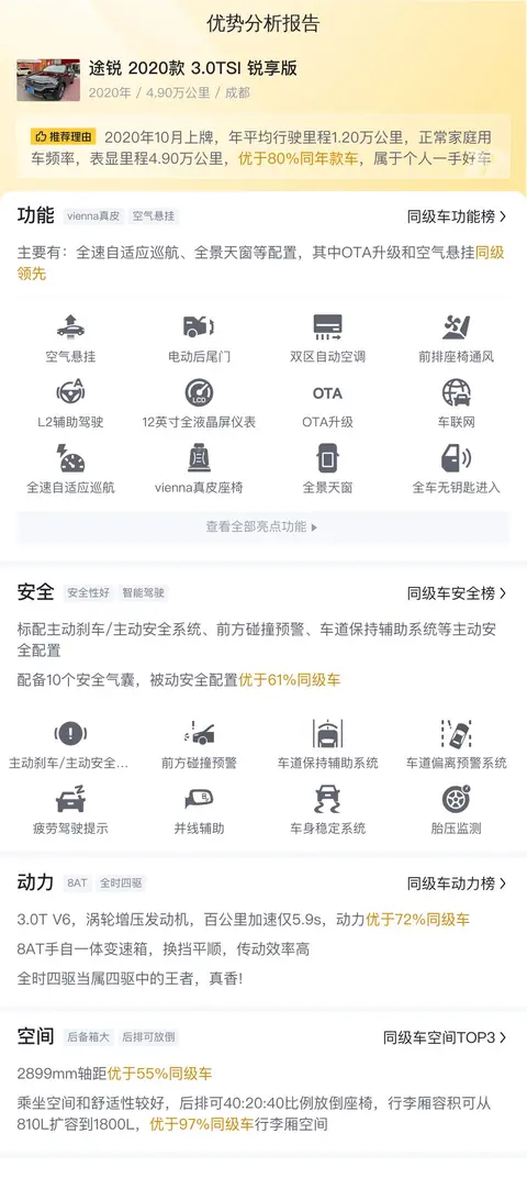 综上所述的新车含税价、用车成本、市场行情、优势分析、同款比价等数据仅供参考。在配置部分,因为二手车非标品,车辆可能会存在配置改装的情况,具体车况信息需要线下结合车辆实际情况进行综合参考。