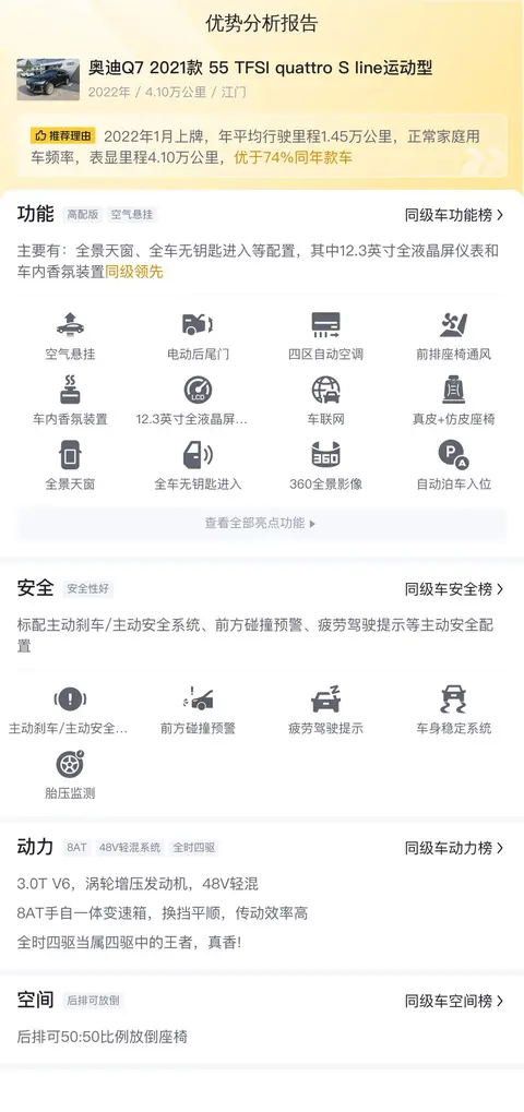 综上所述的新车含税价、用车成本、市场行情、优势分析、同款比价等数据仅供参考。在配置部分,因为二手车非标品,车辆可能会存在配置改装的情况,具体车况信息需要线下结合车辆实际情况进行综合参考。