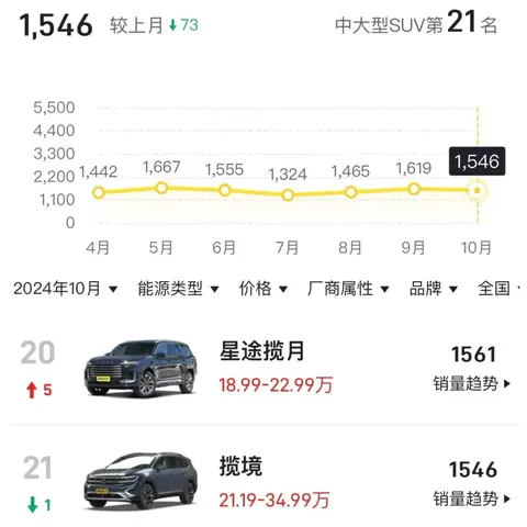 作为一台家用汽车,我觉得除了三大件的可靠性和实用性以外,市场表现也是很重要的因素,一汽-大众揽境(看资讯)市场定位属于30万上下的级别,我们在懂车帝平台了解了一下,10月份销量1546辆,从月销量趋势图来看,4月份到10月份,月销量都在1300辆以上,处于稳定的状态,接下来我们从设计风格、内饰用料、安全配置、空间舒适性以及操控性等方面进行分析!