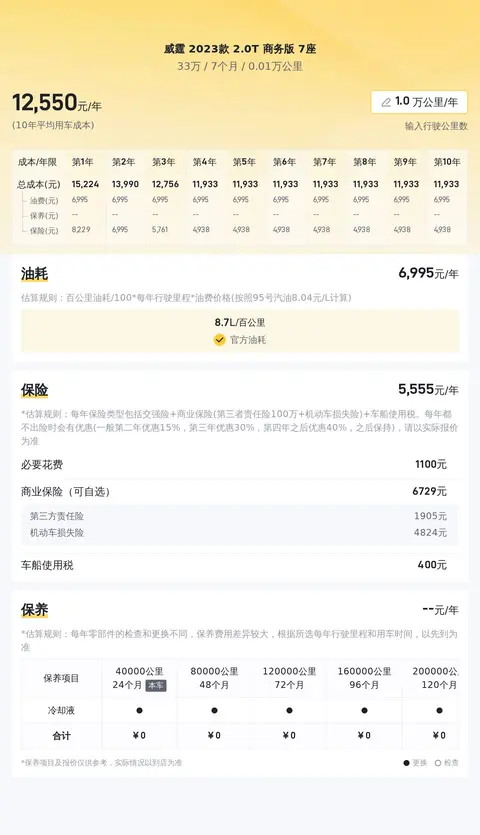 据估算,同级车的最低用车成本是13358元/年,最高是18791元/年,而威霆 2023款 2.0T 商务版 7座是13358元/年,所以比较低。