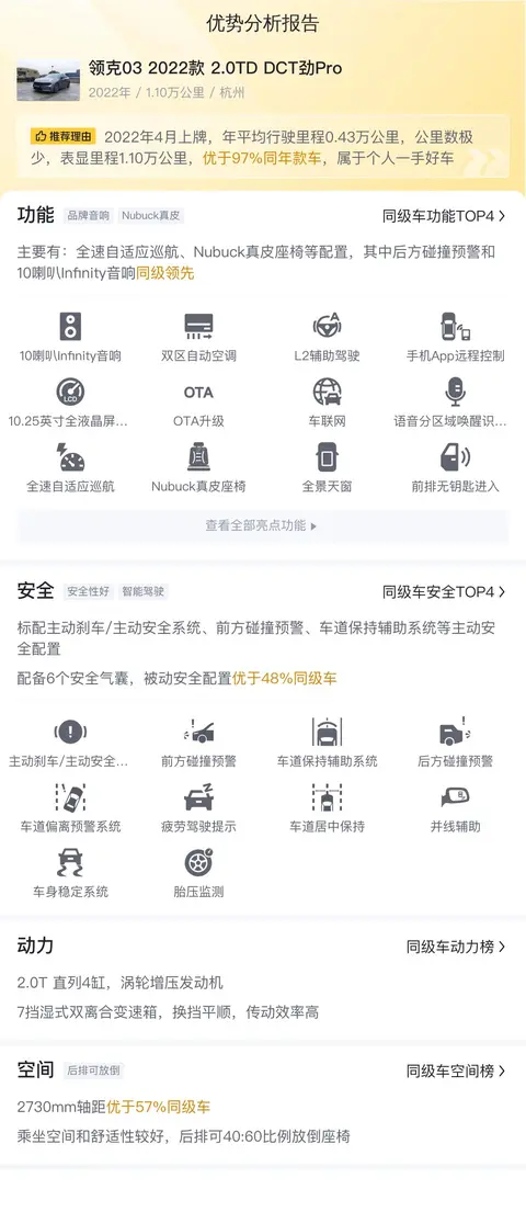 综上所述的新车含税价、用车成本、市场行情、优势分析、同款比价等数据仅供参考。在配置部分,因为二手车非标品,车辆可能会存在配置改装的情况,具体车况信息需要线下结合车辆实际情况进行综合参考。