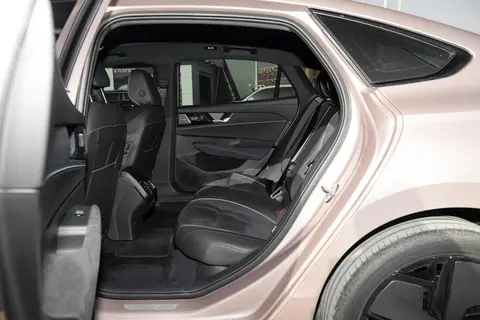 车身侧面,超过5米的车长配合流畅的贯穿式腰线,显得既修长又大气。车窗全部采用了隐私玻璃设计,既实用又增加了私密性。车轮尺寸为245/40 R19,与车身完美搭配。车尾设计与迈腾B9相似,但尾灯内部采用了晶块式光源,科技感更强。底部包围则采用了黑化的鳞片式设计,进一步提升了运动氛围。