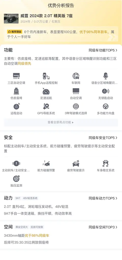 综上所述的新车含税价、用车成本、市场行情、优势分析、同款比价等数据仅供参考。在配置部分,因为二手车非标品,车辆可能会存在配置改装的情况,具体车况信息需要线下结合车辆实际情况进行综合参考。