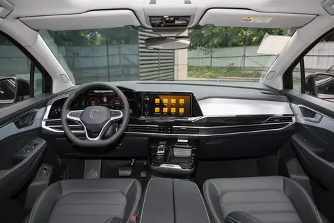 台面大致呈T字形布局,台面为不规则设计,层次感较为丰富,上层以皮质覆面,中层为银色金属板装饰,下层则是贯穿式的空调出风口,岛台设有“兰花指”电子挡把以及15W的手机无线快充面板,岛台和扶手箱为断开式设计,带有下沉式的储物箱。台面搭载10.25英寸的全液晶仪表盘、12英寸的中控屏幕,支持卫星导航系统、导航路况信息展示、车联网、语音识别控制系统、全速自适应巡航、自动泊车入位、360°全景影像等功能,还带有CarPlay以及CarLife手机互联映射等功能,可以进一步丰富车机功能,比如连接手机的音乐软件、导航、微信等。车内还有配备三区空调、车载空气净化器、8个扬声器、哈曼卡顿音响、8个USB/Type-C接口等。