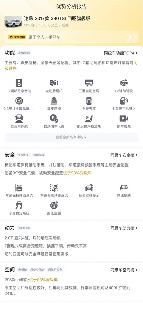 综上所述的新车含税价、用车成本、市场行情、优势分析、同款比价等数据仅供参考。在配置部分,因为二手车非标品,车辆可能会存在配置改装的情况,具体车况信息需要线下结合车辆实际情况进行综合参考。
