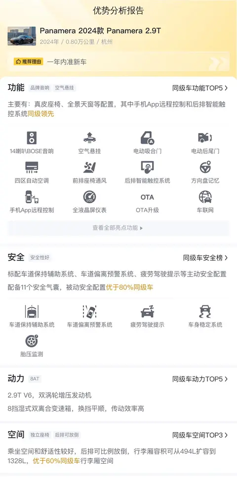 这辆保时捷Panamera的优势方面,个人认为车况绝对是最大优势,准新车,仅上牌8个月,行驶了0.8万公里,个人一手车,这个车况够吸引人了吧?其次就是这辆Panamera的基础配置也挺丰富,毕竟一提到保时捷的选车流程,大家伙儿脑海中是不是只有满屏的加价选装框?但眼前这辆可是选配了不少舒适性装备哦,具体都有哪些,还待您点开文章内的车况链接详阅车况哟~