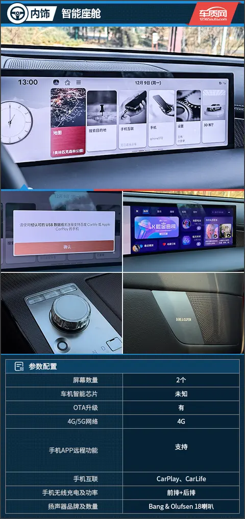 多媒体触控屏的菜单依旧采用横向排列方式,很适合与多媒体触控旋钮搭配使用,操作体验丝滑。同时,系统进行了本土化适配,内置丰富的娱乐功能,能够更好地满足中国消费者的使用习惯。此外,评测车配备了B&O品牌18扬声器音响系统,低音下潜有力,中高音较为通透,并且支持丰富的EQ调节,对于各类音乐都能很好驾驭。稍有遗憾的是CarPlay和CarLife互联功能需要有线连接,使用时略有不便。