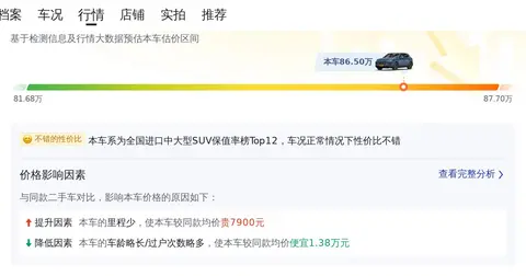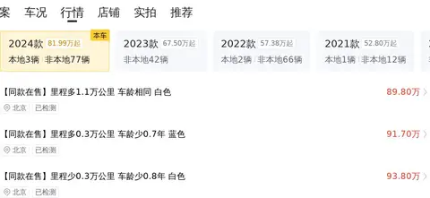 在二手车市场,这款车的报价在75万至89万之间,而本车的售价为86.5万,相较于新车指导价94.8万,具有一定的性价比,尤其是对于追求豪华品牌且预算有限的消费者来说,无疑是一个不错的选择。