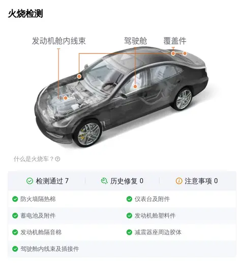 在火烧检测方面,该车也通过了所有7项检测,未发现任何火烧迹象。