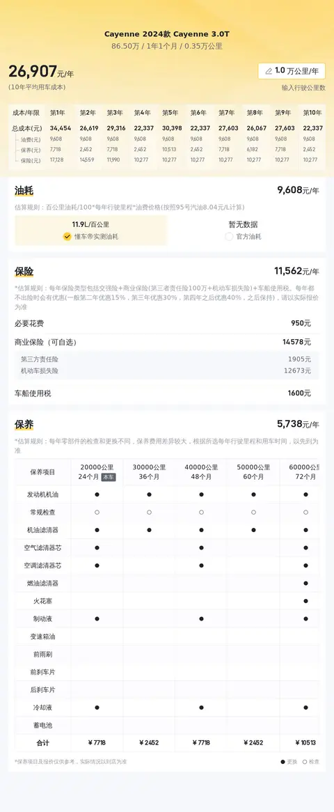 当前市场上,这款Cayenne的二手车价格区间在75万至89万之间,其年均综合用车成本约为2.7万元,对于豪华SUV而言,这一成本在合理范围内。考虑到车辆的性能、配置以及保时捷品牌的影响力,这辆二手Cayenne的性价比相对较高,适合追求驾驶乐趣和豪华体验的消费者选择。
