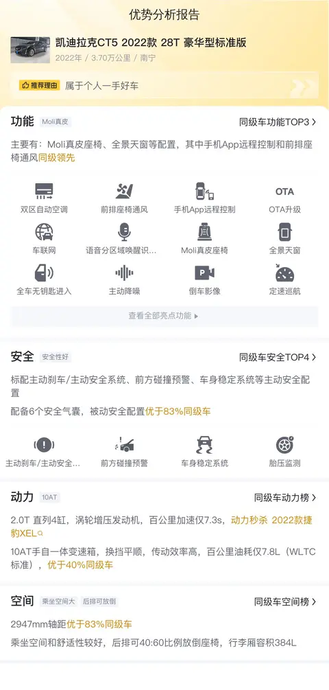 综合来看,这辆凯迪拉克CT5 2022款 28T 豪华型标准版在配置上比较丰富,配备的手机App远程控制和前排座椅通风同级领先。在车身尺寸方面,2947mm轴距优于83%同级车。动力上,搭载的是2.0T 直列4缸,涡轮增压发动机,百公里加速仅7.3s,动力秒杀2022款捷豹XEL。再加上原车主使用过程中比较爱惜,车辆保护的比较好。不过凯迪拉克的品牌力一般,会影响到车辆的保值率,但反过来说,这也是这辆二手车值得选择的原因,因为性价比高。目前这辆二手车的报价是15.88万,相比新车来说,还是很有性价比的。