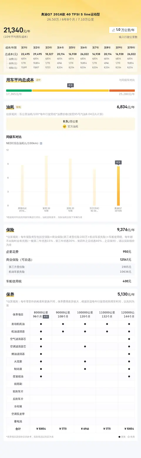 在用车成本方面,根据相关数据估算,这辆奥迪Q7 2016款 40 TFSI S line运动型的年均综合用车成本大约为2.1万元左右。这里需要特别指出的是,这项费用并不包括贷款利息、保险类型以及保养项目的费用,而燃油费用则是按照当前油价进行估算的。因此,实际费用支出可能会因人而异。