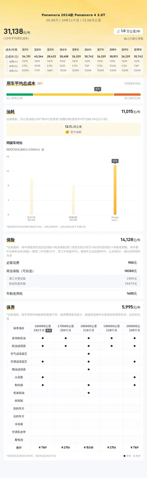 根据懂车帝大数据分析,Panamera 2014款 Panamera 4 3.0T的当前二手车市场行情在19.45万至24.27万之间,具体价格因车况而异。在用车成本方面,按照每年行驶1万公里计算,10年平均用车成本约为31188元/年,油费约11780元/年,保养费约4387元/年,保险费用约14981元/年。请注意,这些数据仅供参考,实际费用可能因个人驾驶习惯、油价波动等因素而有所不同。