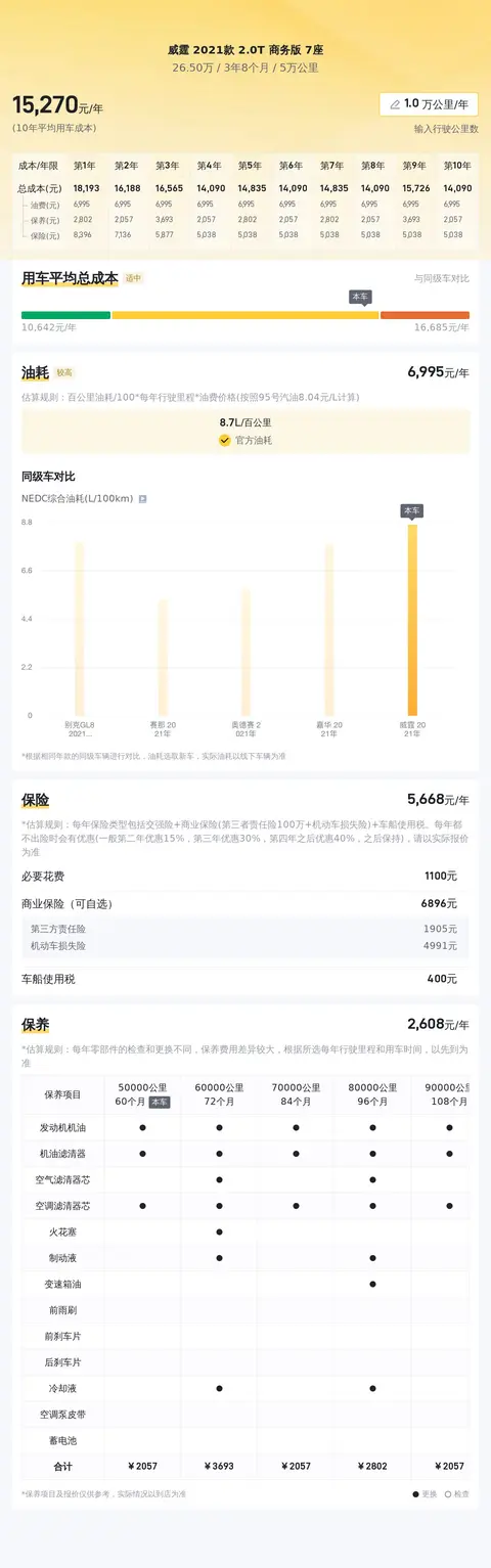 购买二手车,不仅要考虑买车成本,也要考虑用车成本,这辆威霆 2021款 2.0T 商务版 7座的10年平均用车成本大概是15473元/年,而同级别车型的最低10年平均用车成本是14333元/年,最高是16838元/年,所以这辆车的用车成本适中。