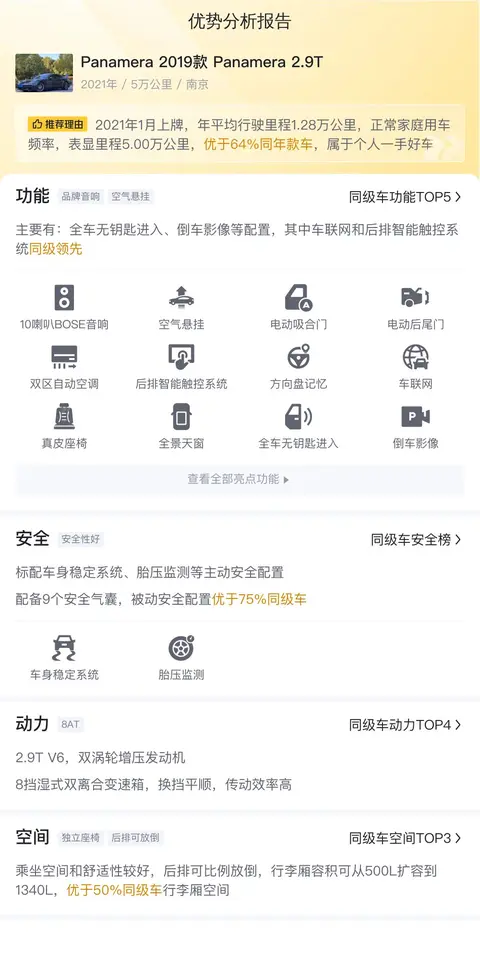总结:以上就是我们对这辆二手保时捷Panamera的全部介绍了,其实买二手车一怕被坑,二怕维修麻烦,三怕用着不舒服。而这辆车首先通过了懂车帝的官方检测,其次品牌方售后在全国都有服务网点,最后这辆车的内饰整洁如新,功能使用良好,基本没什么可挑剔的,如果您对价格满意的话,那么这辆车会是一个不错的选择。