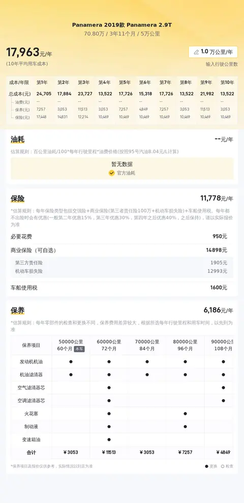 按照当前市场行情,这辆保时捷Panamera的售价在62.75万至75.65万之间,目前的报价为70.8万,处于合理区间。预计再行驶2年后,如车况保持良好,市场无大变动,可卖57万左右。在用车成本部分,这辆车的10年平均成本大约在21702元/年,不过实际费用还是要根据使用者的具体使用强度和使用习惯来决定。