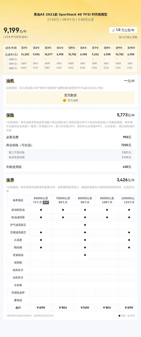 据估算,奥迪A5 2021款 Sportback 40 TFSI 时尚致雅型的用车成本是7194元/年,说实在的,用车成本不算低。