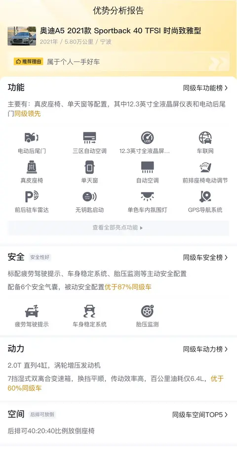 虽然是2021款的车,但整体的配置还是很丰富的,奥迪A5 2021款 Sportback 40 TFSI 时尚致雅型配备了真皮座椅、单天窗等配置,其中12.3英寸全液晶屏仪表和电动后尾门同级领先。
