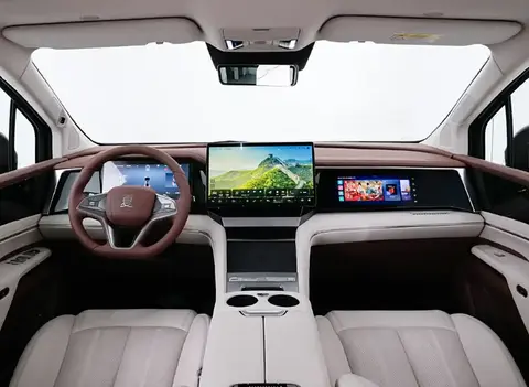 内饰方面,新车的米色和棕色搭配给人一种雅致大方的印象,同时不乏时尚和豪华感。配置悬浮式中控屏幕,中央扶手区域面积开阔,配置双无线充电面板,有两个杯架。座位布局为7座,前面一二排各两个座位,第三排为三座设计。提供车载冰箱、前排靠背小桌板、二排吸顶屏幕等功能,两边车门面板上都有控制按钮,可以调节座椅通风加热和空调风量等。