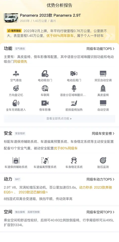 综上所述,当考虑购入一辆保时捷Panamera作为日常使用兼商务出行的座驾时,2023年款的2.9T车型是一个既不失豪华气质又兼备驾驶乐趣的选择。其合理的价格区间使得它在同级别车型中显得更具市场竞争力。无论是在城市中穿梭还是长途旅行,Panamera都能提供舒适的驾乘体验,并在合适的时候展现出保时捷品牌的运动精神。对于那些追求卓越品质和驾驶乐趣的消费者来说,一辆车况良好、价格合理的二手Panamera无疑是步入保时捷世界的理想选择。