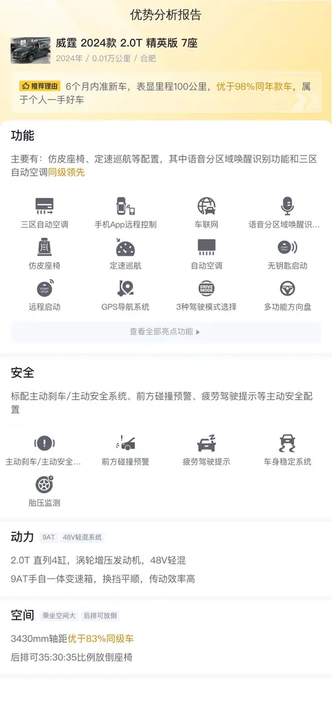威霆 2024款 2.0T 精英版 7座,新车含税价35.88万,现在的二手车报价28.8万。
