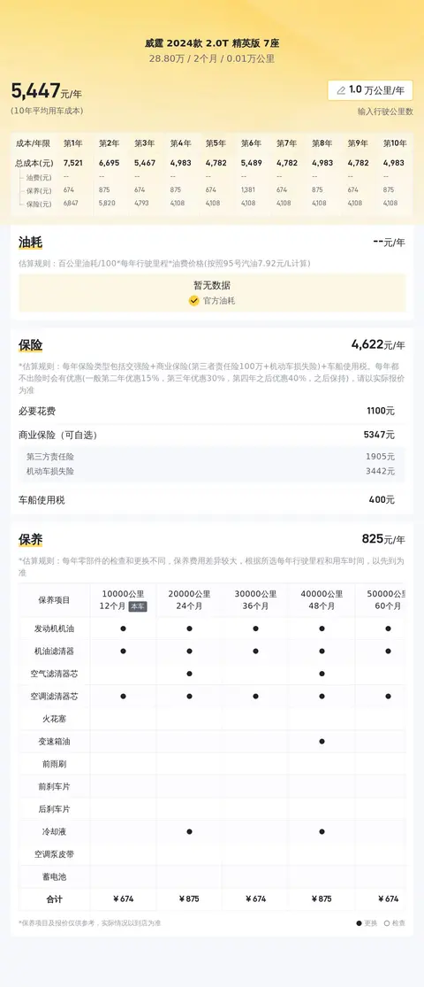 这款车的10年平均用车成本约为每年1.4万元,这一成本在同类车型中处于适中水平。考虑到其品牌影响力、配置丰富程度以及动力性能等因素,这一用车成本相对合理。