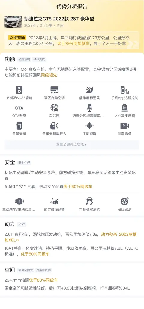 优势:价格实惠,只有17.18万,近30万的车,价格不到20万,而且里程只有两万公里,基本是准新车的状态。配置丰富,该车配有双区自动空调、全车无钥匙进入、第二排座椅放倒、前排座椅通风加热、全景天窗等配置,舒适性和便利性都不错。动力强劲,百公里加速仅7.3s,能秒杀2022款捷豹XEL。