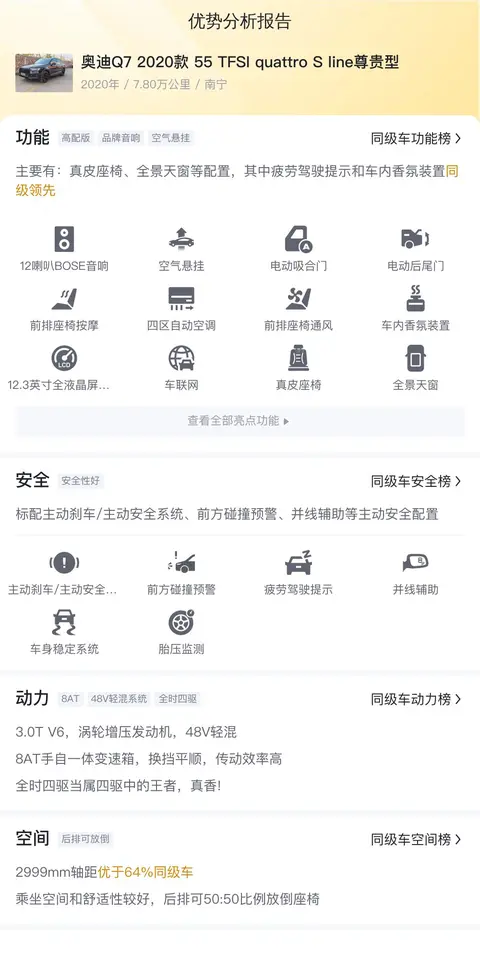 奥迪Q7 2020款 55 TFSI quattro S line 尊贵型与同级别车型在功能配置方面的对比分析。通过深入剖析本车型的功能配置装备与同级别竞品的对比情况,我们将助您洞察其产品力的竞争力与特点。无论您正着眼于购买决策或是单纯好奇,下列分析都将为您提供有价值的参照及谈资。