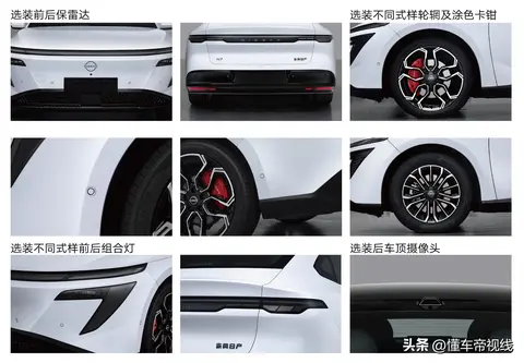 车身侧面,东风日产N7有一定溜背式设计,由于使用了隐藏式门把手车侧型面相对简洁,同时新车配备了无框车门,官方公布其风阻系数为0.208。本次曝光的燕麦米实车提供花瓣式铝合金轮辋及红色刹车卡钳,结合申报信息,新车还提供另一款多辐式轮辋,轮胎规格为225/55 R17或225/45 R19。