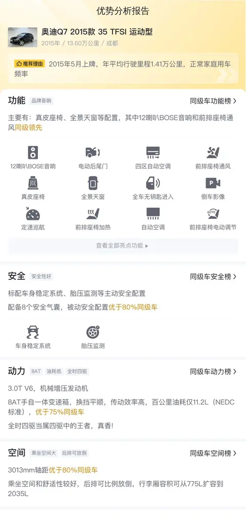 用车成本方面,根据估算,这辆奥迪Q7的年均综合用车成本约为2.6万元。需要注意的是,实际费用可能会因使用频率、环境条件和个人驾驶习惯等因素而有所不同。