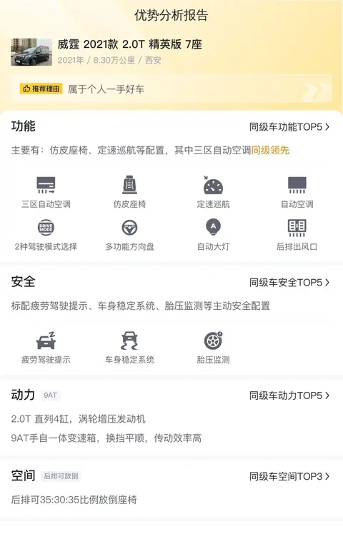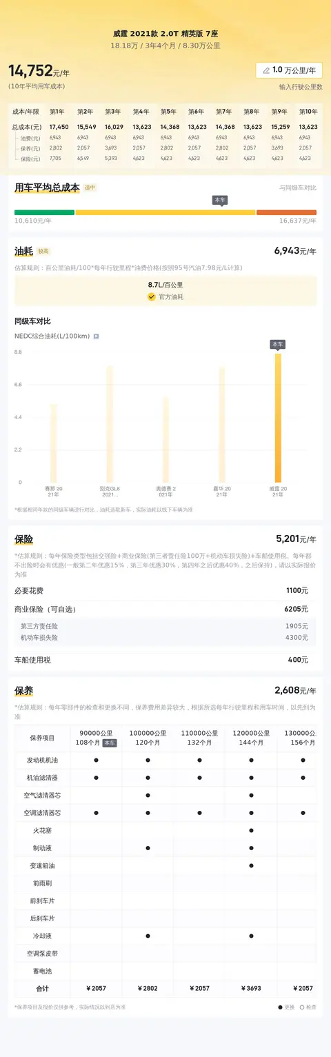 据估算,同级车的最低用车成本是13988元/年,最高是18171元/年,威霆 2021款 2.0T 精英版 7座是15033元/年,用车成本适中。