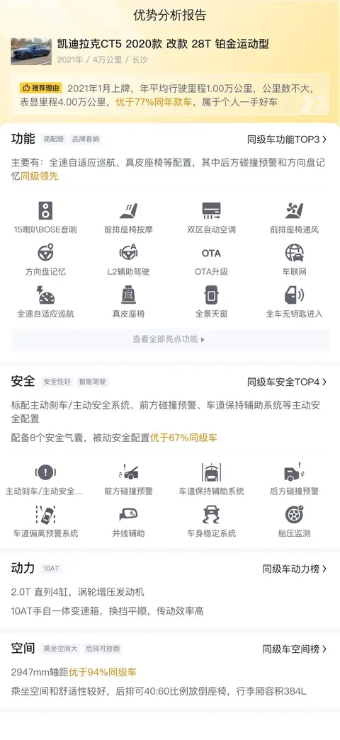 凯迪拉克CT5 2020款 改款 28T 铂金运动型拥有丰富的配置,主要包括全速自适应巡航、真皮座椅等,其中后方碰撞预警和方向盘记忆同级领先。动力方面,搭载2.0T 直列4缸,涡轮增压发动机,10AT手自一体变速箱,换挡平顺,传动效率高。2947mm轴距优于94%同级车,乘坐空间和舒适性较好,后排可40:60比例放倒座椅,行李厢容积384L。