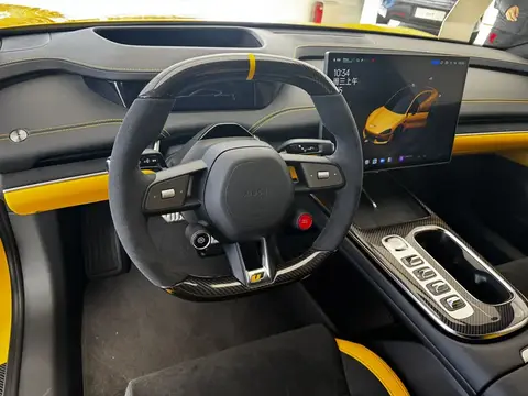 小米SU7 Ultra方向盘进行了全新设计,采用上下平面的赛车风格,材质升级为碳纤维,手握处包覆Alcantara超细纤维面料,手不容易打滑;方向盘12点方向加入黄色回中标识,激烈操控时更好地帮助判断方向盘指向。全新设计搭配黄色安全带和方向盘红色Boost按键,让小米SU7 Ultra内饰战斗气息拉满。