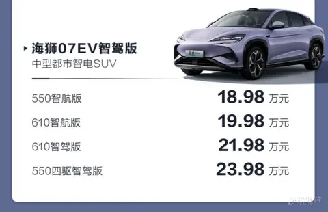 比亚迪海狮07EV(询底价|查参配)智驾版共推出4款配置车型,售价区间为18.98-23.98万元,新车主要对智驾系统进行升级,中低配两款车型配备天神之眼 C-高阶智驾三目版(DiPilot 100),而高配两款车型搭载天神之眼 B-高阶智驾激光版(DiPilot 300),外观和内饰则延续现款车型设计。