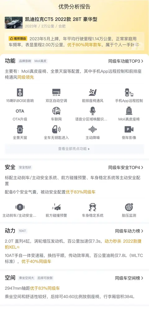 综上所述的新车含税价、用车成本、市场行情、优势分析、同款比价等数据仅供参考。在配置部分,因为二手车非标品,车辆可能会存在配置改装的情况,具体车况信息需要线下结合车辆实际情况进行综合参考。