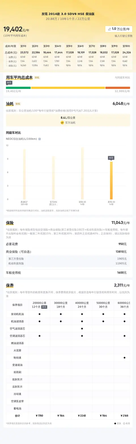 根据懂车帝的大数据分析,发现 2014款 3.0 SDV6 HSE 柴油版的10年平均用车成本是18693元/年,而同级车最低是17070元/年,最高是31507元/年,所以它的用车成本不算低。