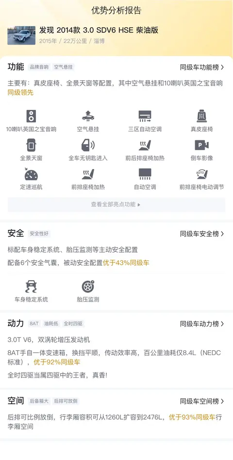 发现 2014款 3.0 SDV6 HSE 柴油版配备了真皮座椅、全景天窗等配置,其中空气悬挂和10喇叭英国之宝音响同级领先。