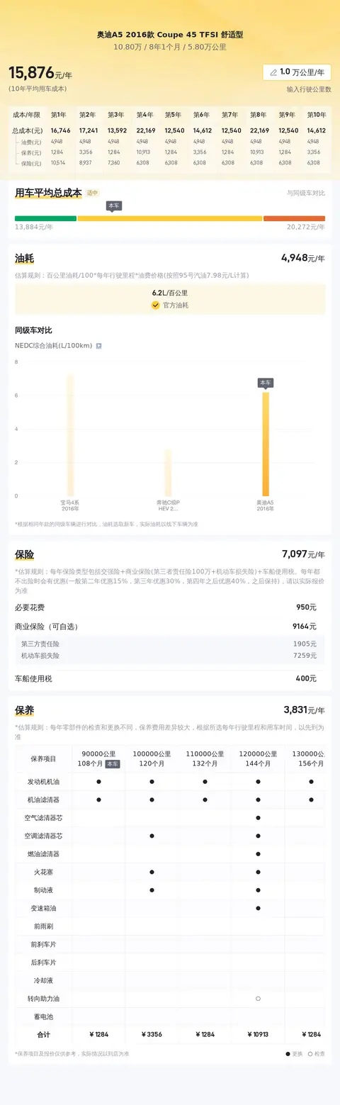 在用车成本部分,根据估算,这辆车的年均综合用车成本约1.6万元左右,实际费用开销会根据车主的使用情况而变动。