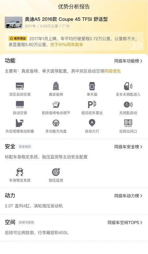这辆奥迪A5 2016款 Coupe 45 TFSI 舒适型配备了真皮座椅、单天窗等配置,其中双区自动空调更是同级领先。官方百公里加速6.9秒,动力强劲。2.0T直列4缸,涡轮增压发动机,最大功率224马力,最大扭矩350牛·米,CVT无级变速(模拟8挡),换挡平顺,传动效率高。后排可比例放倒,行李厢容积455L,优于92%同级车。