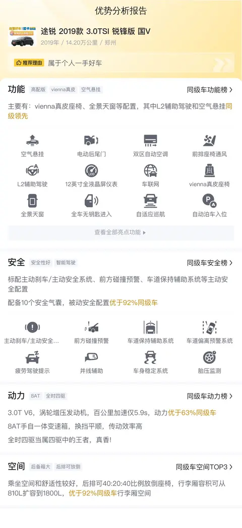 除了好的配置,动力也是非常重要的一个衡量指标。这辆车搭载了3.0T 340马力 V6发动机,最大扭矩450牛·米,匹配8挡手自一体变速箱,采用全时四驱系统。悬架类型为多连杆式独立悬挂。百公里加速仅5.9s,动力优于63%同级车。途锐的8AT手自一体变速箱,换挡平顺,传动效率高。全时四驱当属四驱中的王者,真香!