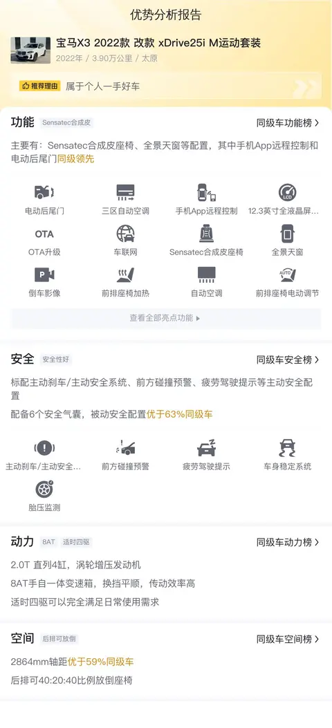 综上所述,我们不难看出,这辆宝马X3 2022款 改款 xDrive25i M运动套装不仅以其合理的售价赢得了潜在买家的关注,更通过其卓越的性能、舒适的驾乘体验以及先进的科技配置,展现出了宝马品牌的深厚功底与创新能力。在面对市场竞争时,这款车凭借其独特魅力与实力,成功地吸引了消费者的青睐,成为了市场中的佼佼者。