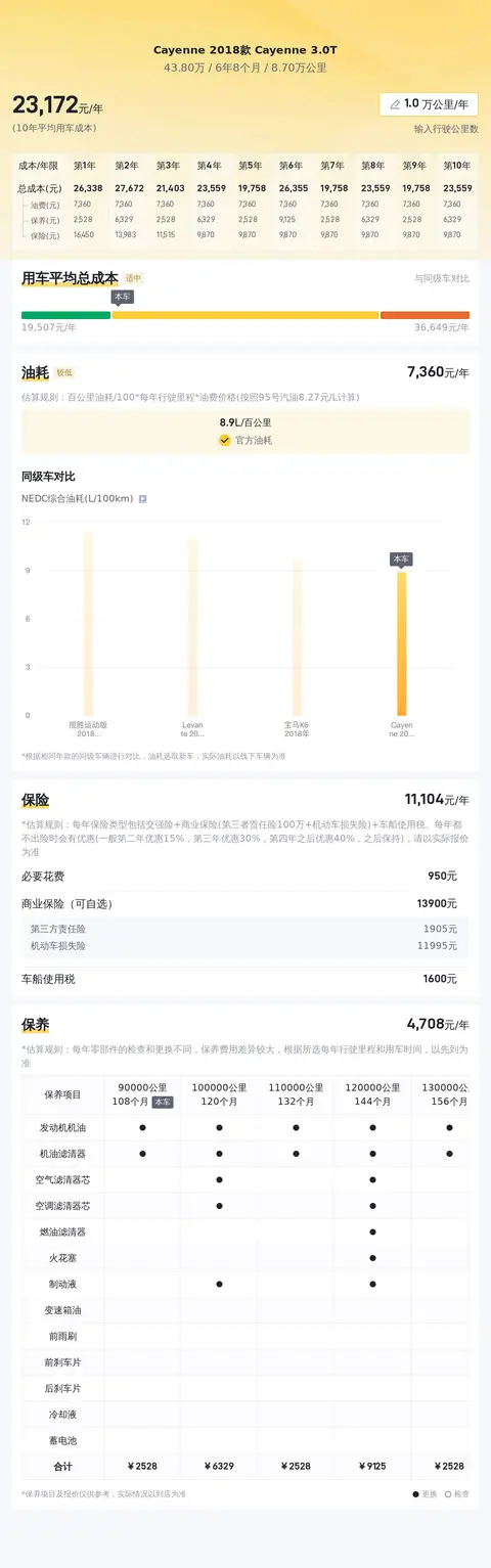 购车不只是买车的钱,还有养车的钱。根据估算,这辆保时捷Cayenne的十年平均用车成本约为23185元/年,这对于一辆豪华型SUV来说,算是正常用车成本。