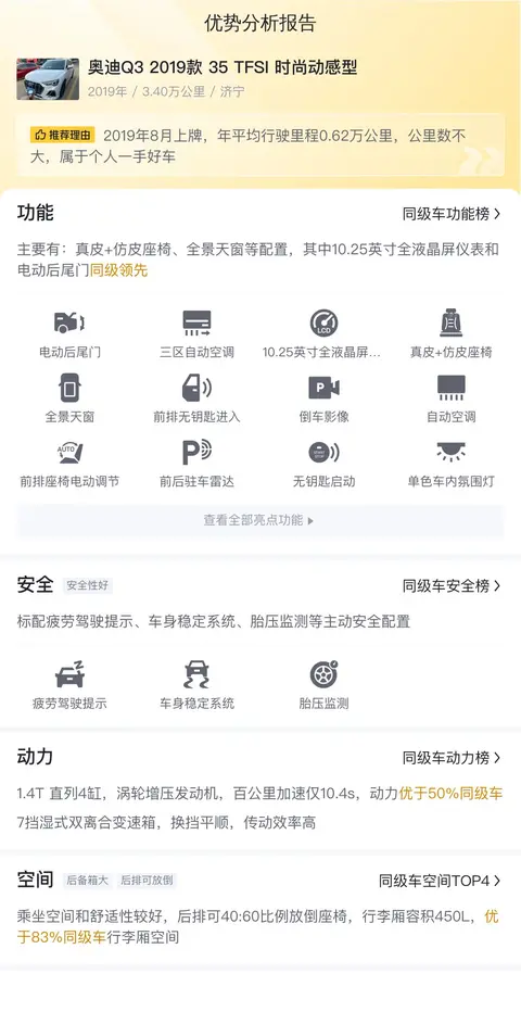 综合市场行情和车辆实际情况,这辆二手奥迪Q3的售价相对合理。对于那些想要购买一辆性能卓越、配置丰富且价格实惠的豪华SUV的消费者来说,这辆Q3无疑是一个不错的选择。当然,在购买二手车时还需要注意车辆的保养记录、行驶里程以及是否有过重大事故等情况,以便更好地了解车辆的真实情况并做出明智的决策。
