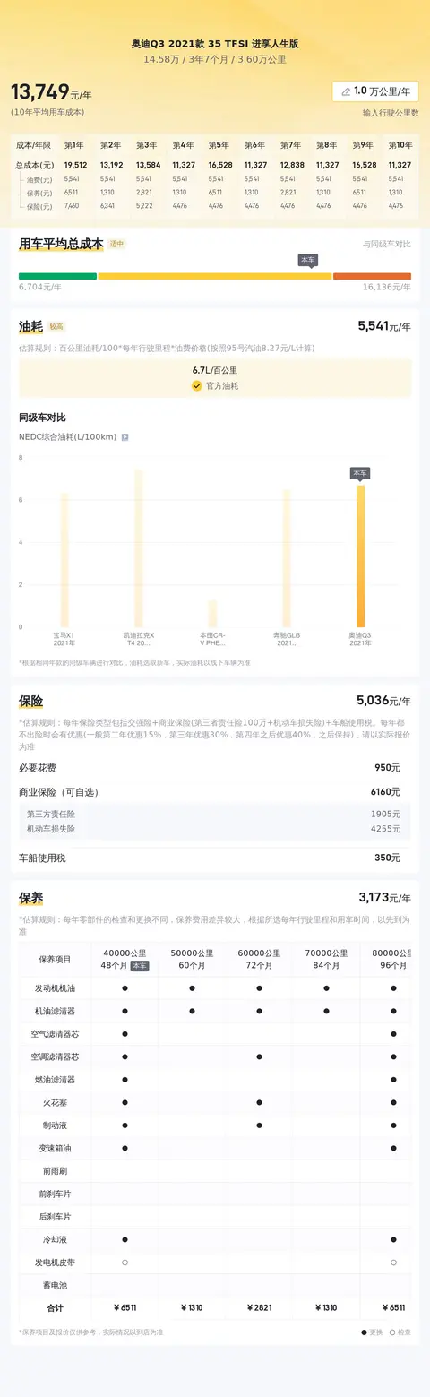 根据估算,奥迪Q3 2021款 35 TFSI 进享人生版的10年平均用车成本约为14180元/年,而本车10年平均用车成本约为14177元/年,与同级别车相比,较为适中。当然,实际费用还会根据车主的实际使用情况有所变动。